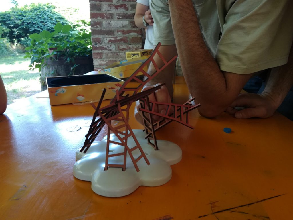 È tipo Jenga! ma al contrario, aggiungi anziché togliere, con le scale al posto dei mattoncini, con un dado che ti dice con che criterio posizionarle, con delle penalità se tocchi la nuvola, con le lacrime della luna, ok scusate non assomiglia a Jenga manco per niente.
